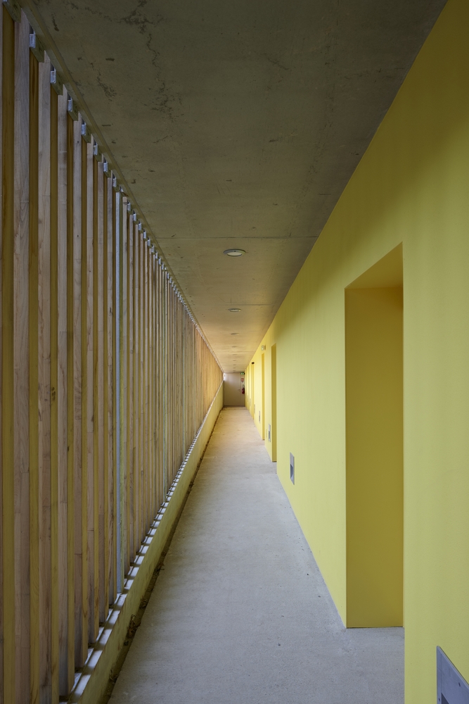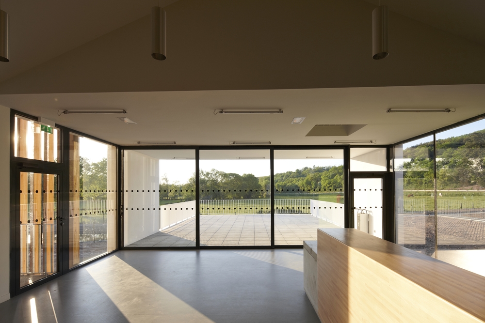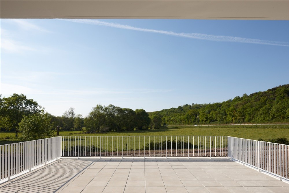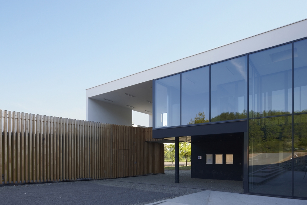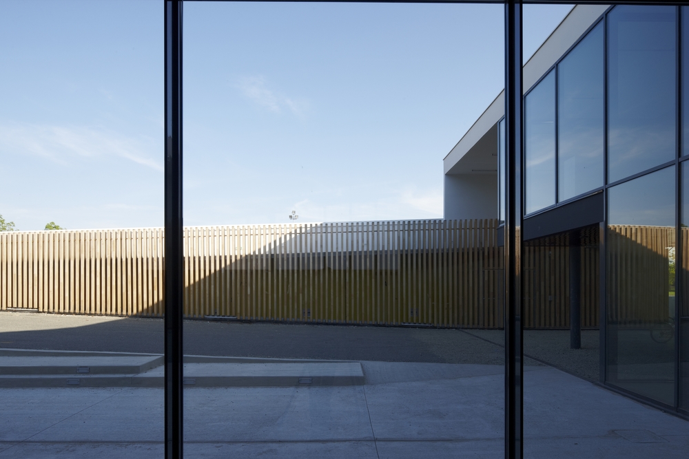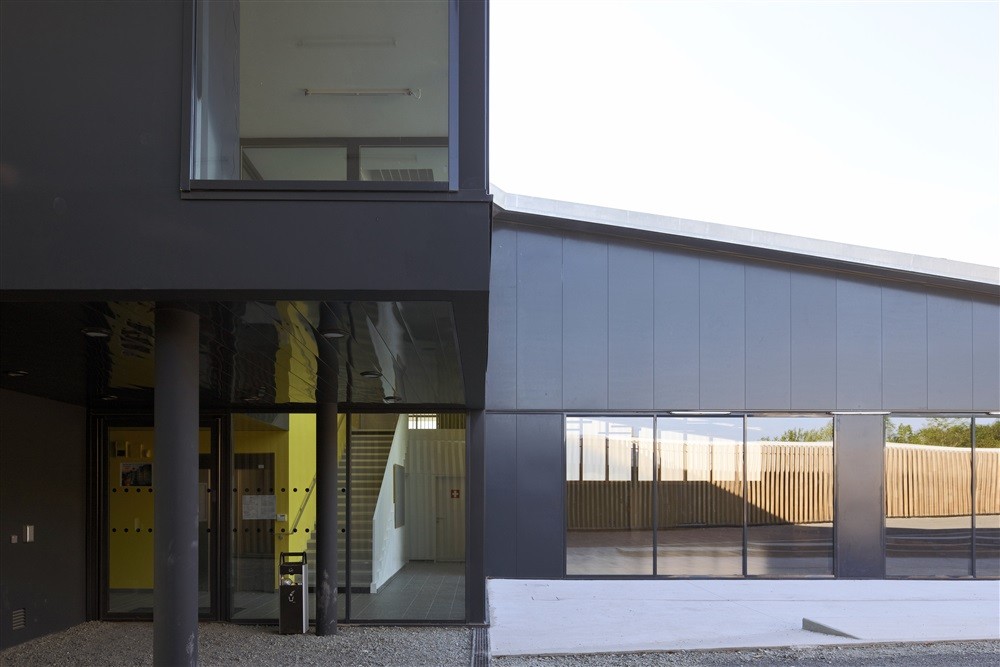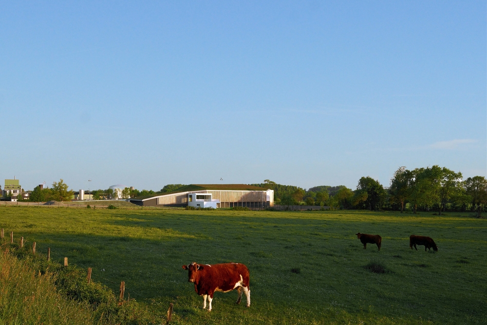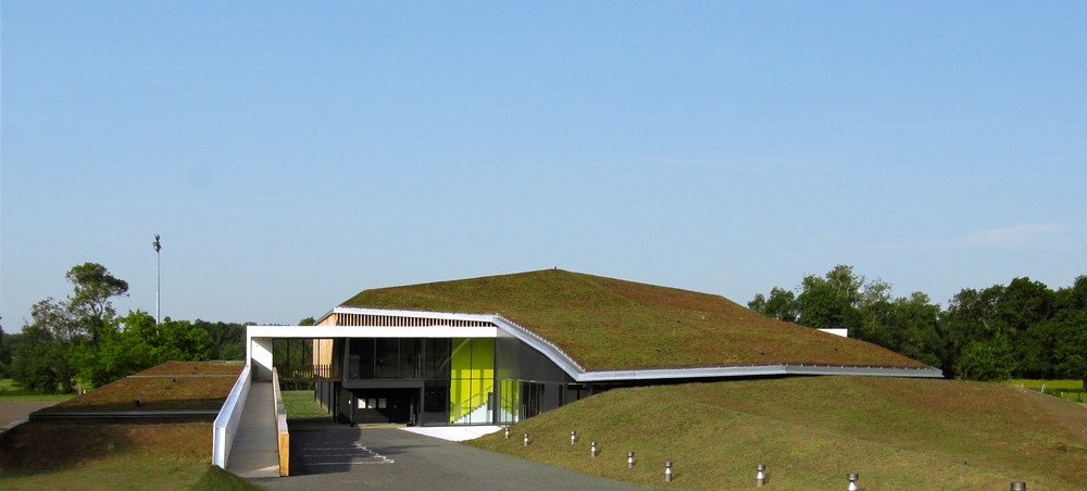 Le bâtiment s’inscrit dans le paysage, et au-delà dans son territoire, en jouant de mimétisme et d’émergence tel un côteau.