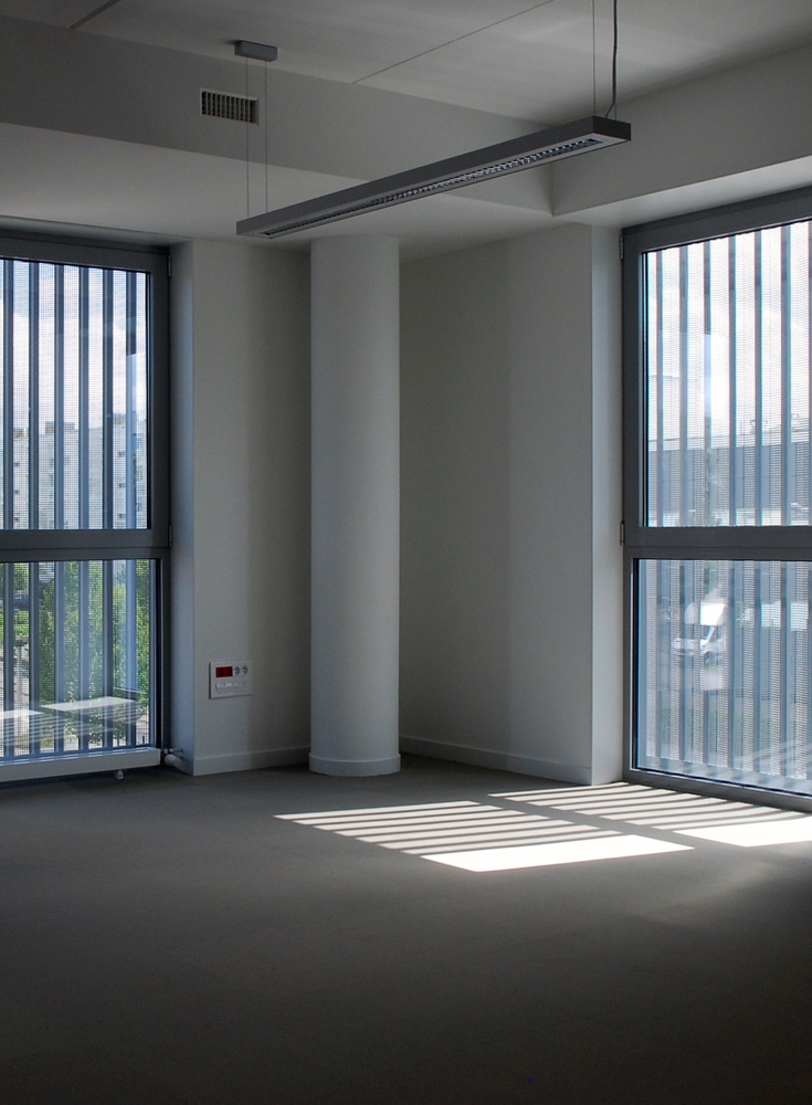 Les surfaces de bureaux se répartissent sur quatre plateaux aménagés efficacement le long d’une circulation centrale. La trame constructive (structure, élements de façade, réseaux techniques) permet d’adapter
