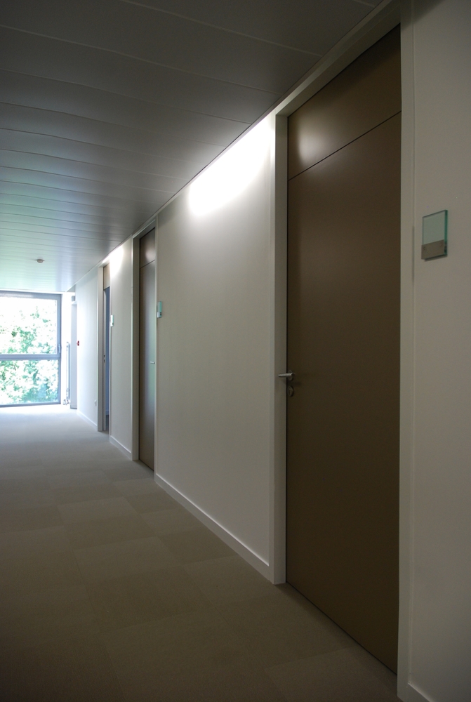 Les façades double peau, à ossature légère, reprennent volontairement la tonalité gris aluminium et l’expression de l’horizontalité des niveaux.