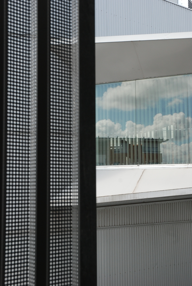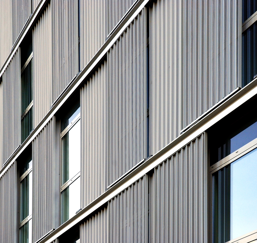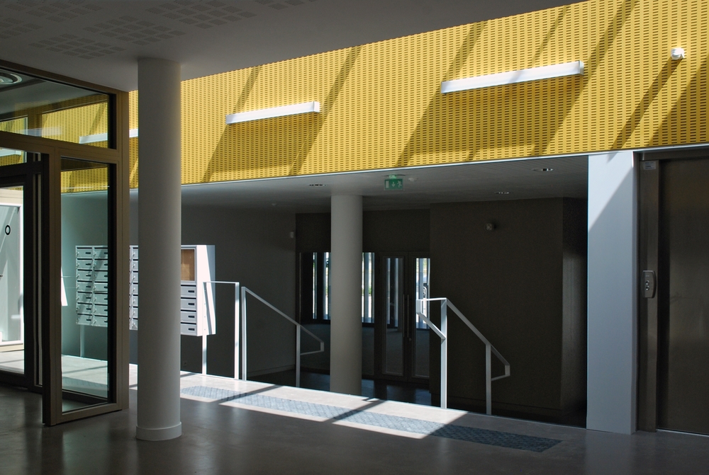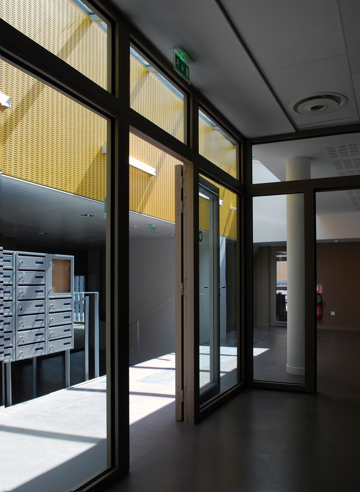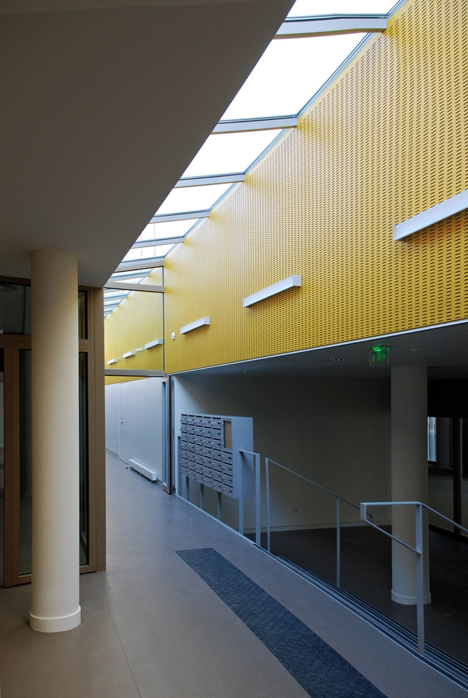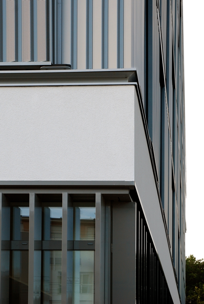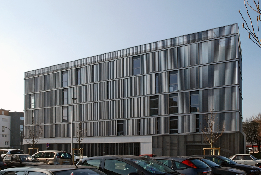 Au sud-est, outre l’alternance des pleins et des vides ordonnancés suivant la modularité des plateaux libres intérieurs, le fçade est rythmée par des protections solaires verticales coulissantes en même bardage, perforé.