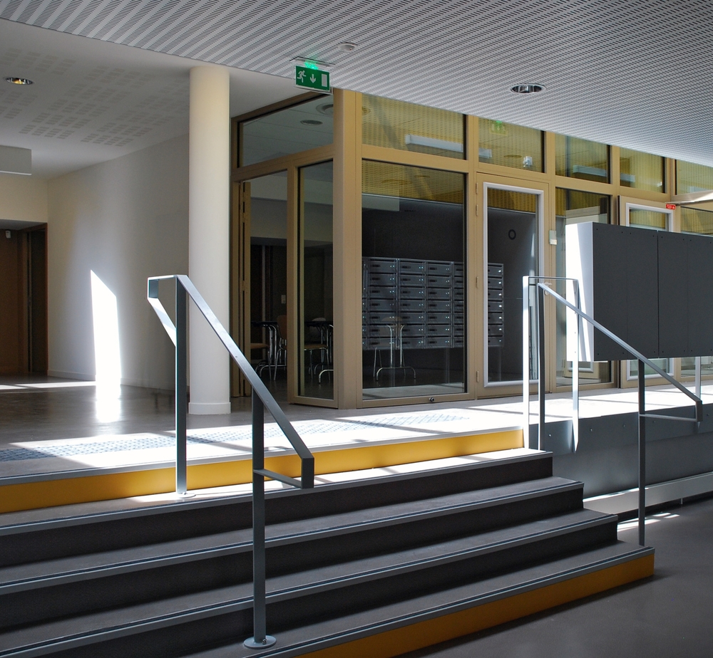 L’accès principal de l'ensemble a été clarifiée par la suppression d'un ancien logement de gardien. La courbe de la façade sud-ouest, ainsi recomposée, guide et accompagne le visiteur.