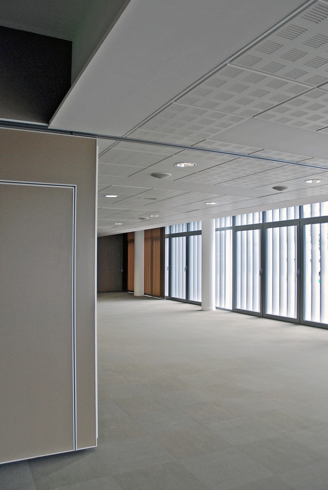 Le niveau du rez-de-chaussée regroupe naturellement le nouvel accueil ainsi que la majorité des salles d’information, de réunion et de réception, mutualisées.