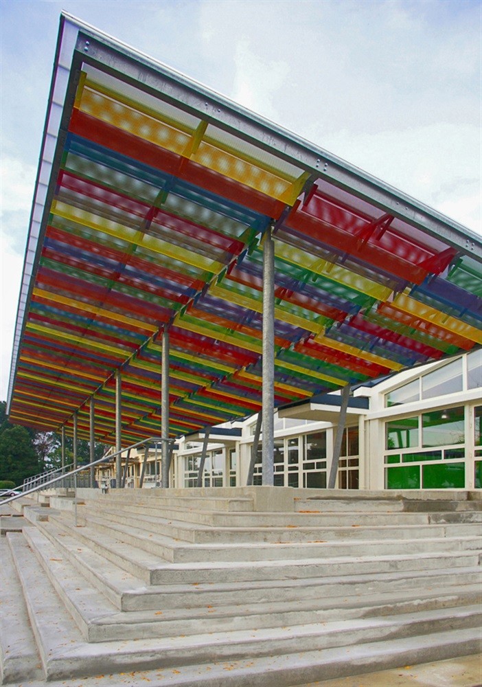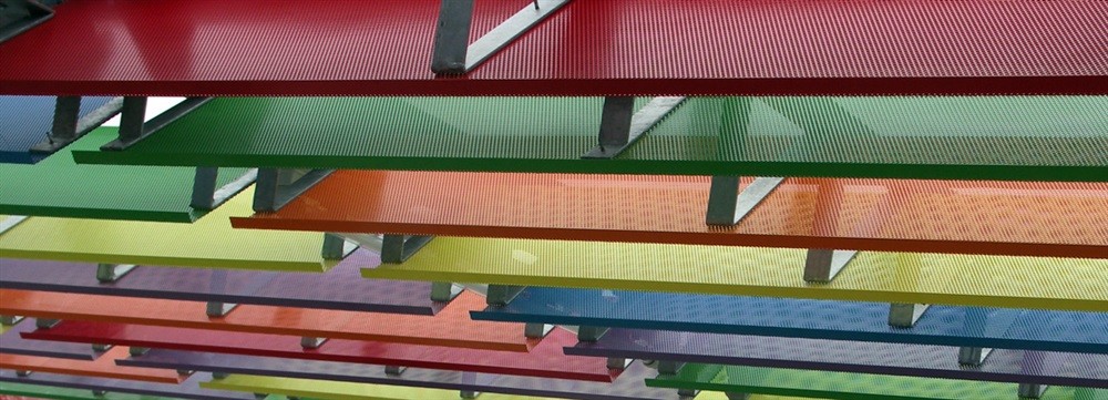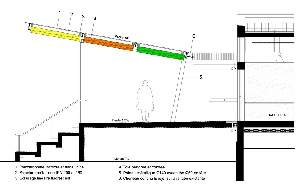 Zoom sur la sous-face en lames de tôle perforée colorée