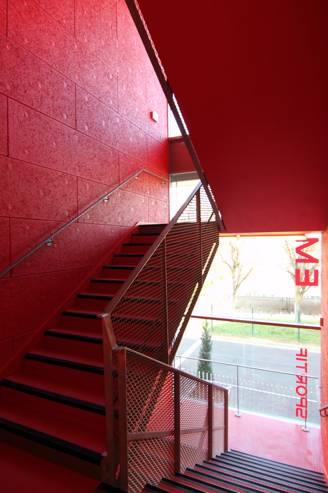 L’ensemble est fédéré par une enceinte en béton dont la surface est travaillée graphiquement avec une lasure anti-graffitis. L’aspect du soubassement ainsi obtenu met en valeur par contraste la lumière naturelle captée dans la salle multisports et restituée par la transparence du hall et des espaces de convivialités propre à chaque activité sportive.