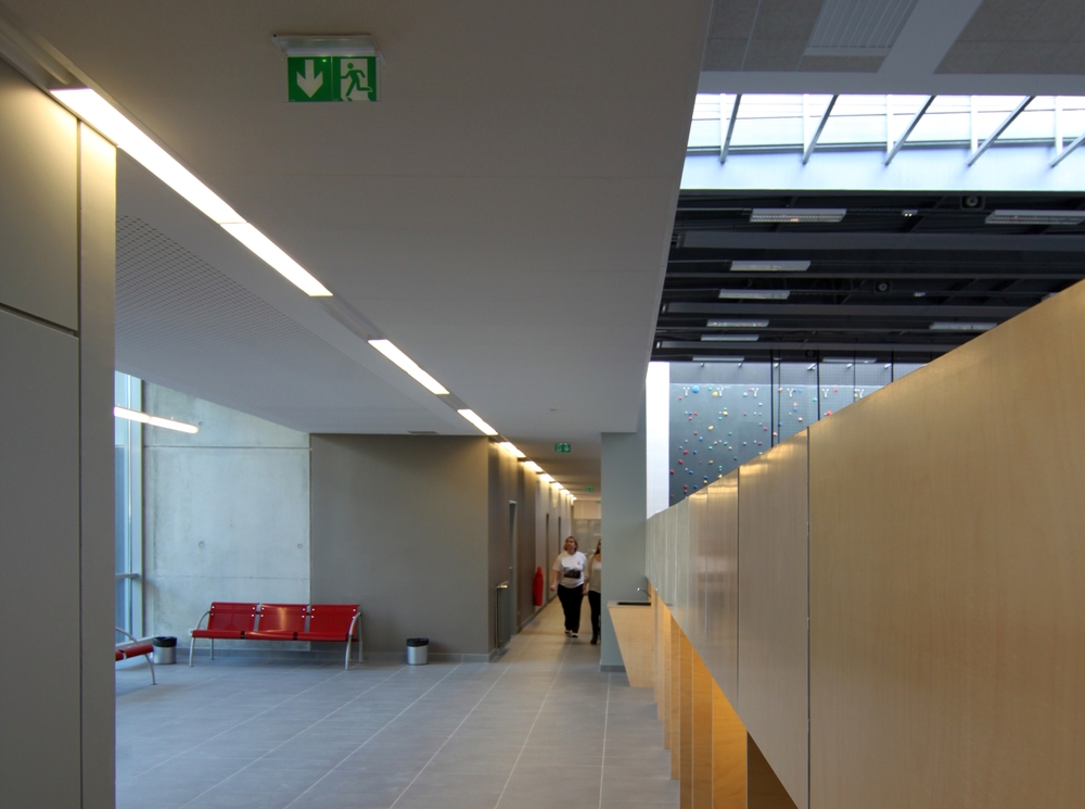Trois éclairages zénithaux ponctuent la longueur de la salle tandis qu’une ouverture de faible hauteur au sud, en pied de talus, permet d’ouvrir visuellement l’espace sur l’extérieur sans remettre en cause pour autant le confort de jeu.