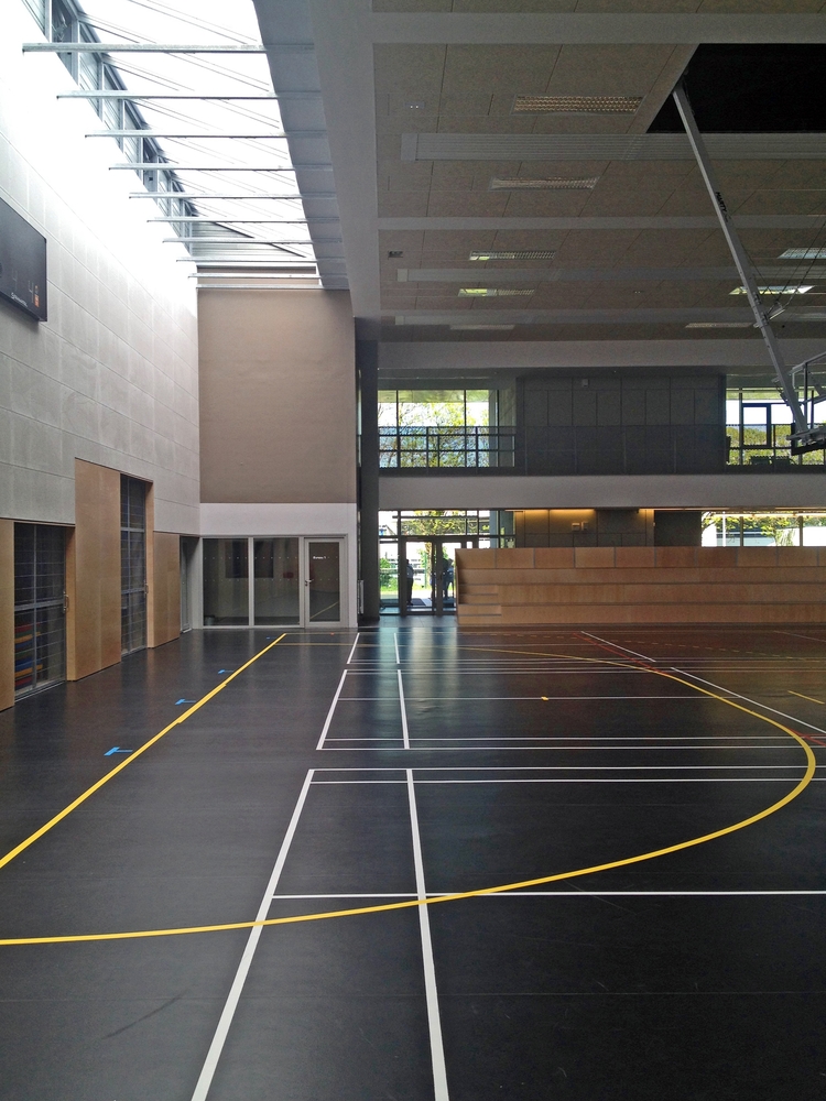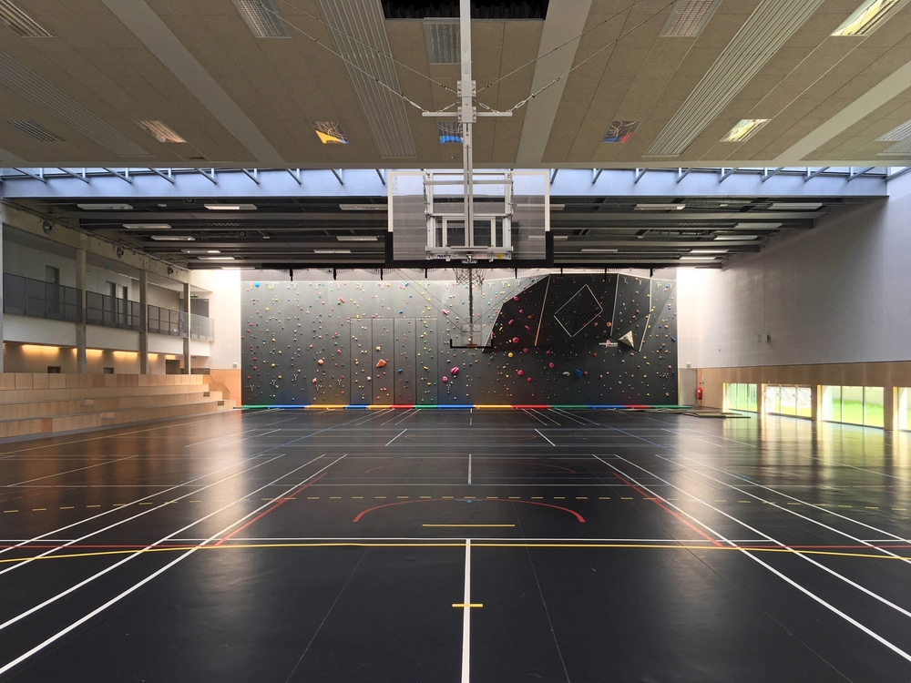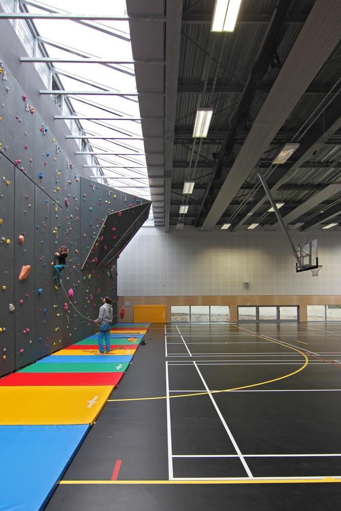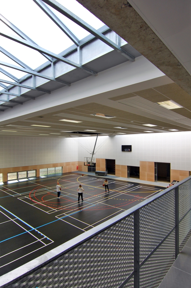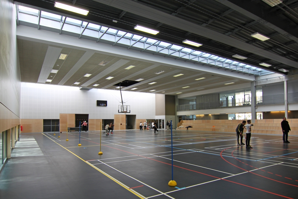 Entre ces deux entités est placé le volume majeur de la salle multisports. Son ambiance intérieure rappelle volontairement la « culture urbaine » dans laquelle les jeunes se reconnaitront. Néanmoins, les panneaux en bois utilisés en basse périphérie réintroduisent de la chaleur au même titre que l'assise menuisée des tribunes, la couleur des vestiaires et des tracés de jeux.